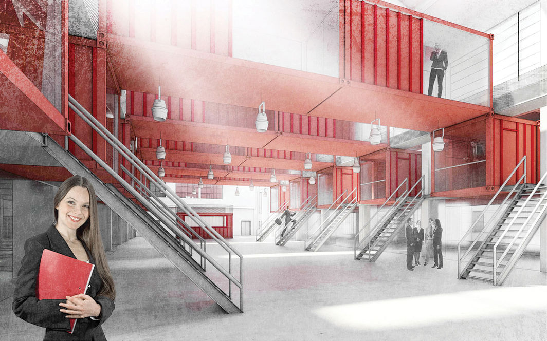 Se zachováním navrženého rozmístění provozů předkládáme dvě varianty prostorového řešení hlavní haly. V přízemí jsou vždy obchody, kavárna a restaurace orientované do středu haly, v kontejnerech pak kanceláře o velikosti dvou až tří kontejnerů - zhruba 30m2 a 45 m2. Sdružováním kontejnerů a zvětšením modulů lze ještě navýšit plochu kanceláří v obou variantách.